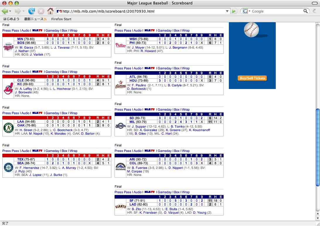 そして2位のワイルドカード争いは、サンディエゴが負け、ロッキーズが勝ったので同率で並び、明日一日だけのワンゲーム・プレーオフとなりました。