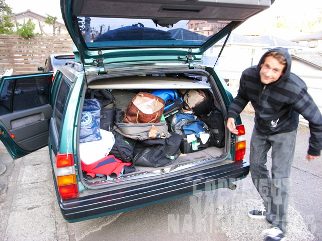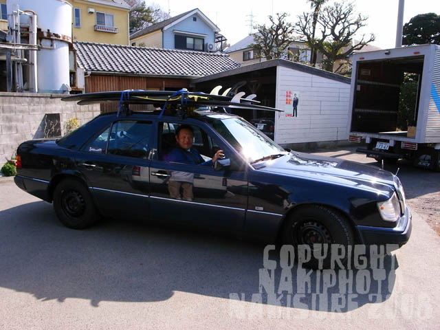 で、AVISOクルーは鎌倉を経て、辻堂のデニーズで朝食を摂り、駐車場でボードの積み替え大作戦決行中。