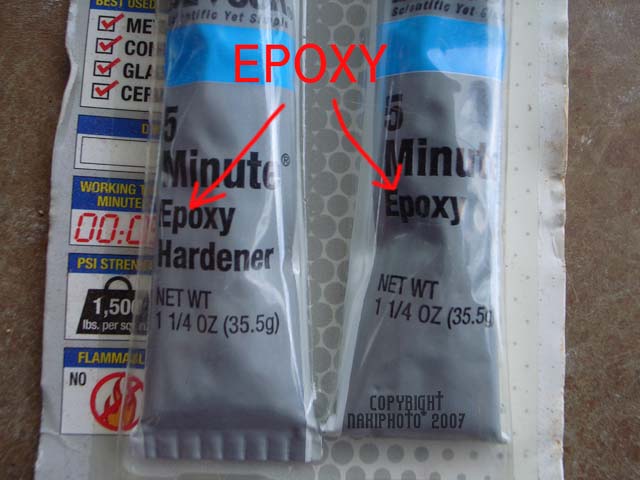 今からでは間に合わないので、帰りに日曜大工屋で2液性エポキシを購入し、