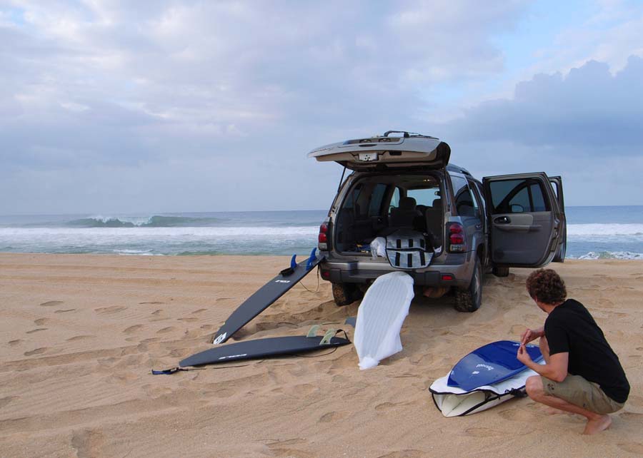 長さとスタイル、モデル、世界選りすぐりのシェイパーたちの自信作のマスターコピーであるカーボンファイバー、中空製のAVISOボードを複数持ち、波を見て悩む。
