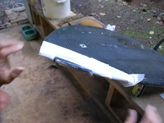 ↓次に先ほど切ったファイバークロスを修理箇所にのせます。