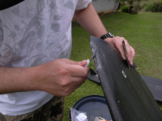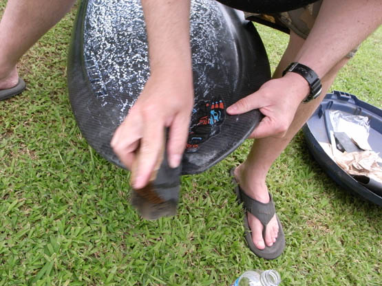 次はそこに先ほどカットしたカーボンファイバーを載せて、エポキシ樹脂を上からかけて、浸透させながら修理箇所になじませます。