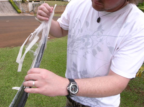 樹脂がカーボンファイバーの上下に行き渡ったらクリアーラップで修理箇所をこのように覆います。↓