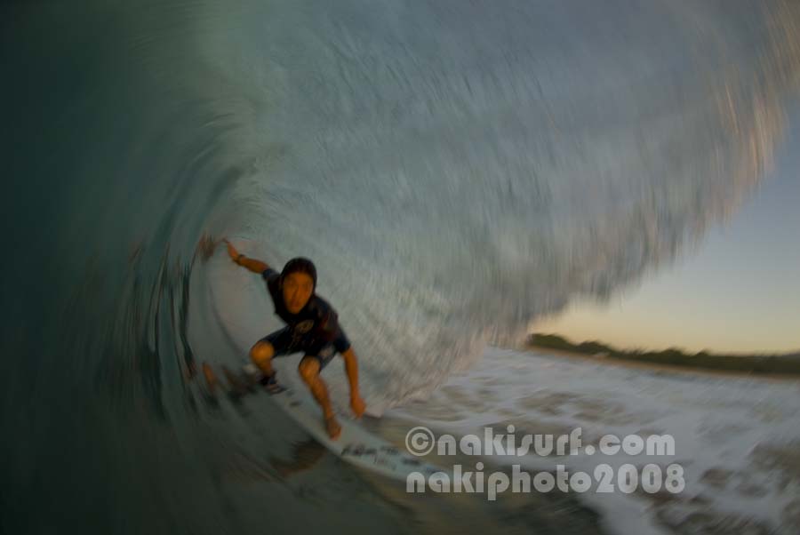 カメラとボードを取り替え、ラインナップに戻り、つるつるなブレイクのピークから降り、そのままバレルに入り込んだ。