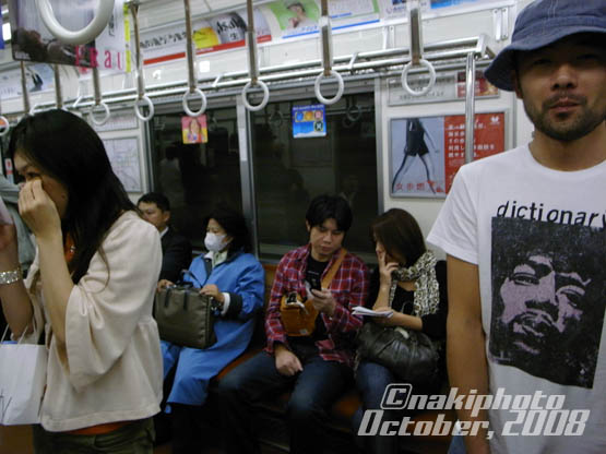 食倒れ後、とおるに起こされ、Gラヴのライブがあるので電車で心斎橋に向かっていると、吊革に掴まりながら化粧をする娘を発見し、その模様をとおるを使って一枚。