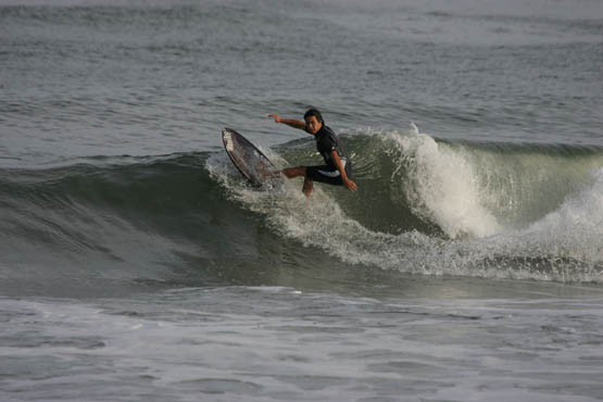 ↑この位置で波のどの箇所で切り返すかを見極め、ボードを左手、左側、岸側に大きく切り返し始めます。