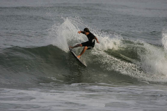 ↑この位置で波のトップに行くので、オフザリップのテイル重視のピヴォットターンになるべく、右足を強く踏み、左足は軽くリードする程度に沿え、先ほどの左肩を岸側に入れるようにしっかりと意識します。