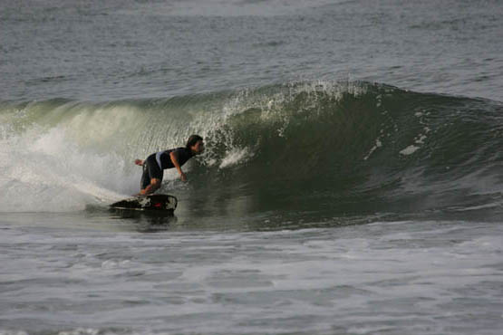 この手前で足を波側に折りたたみ、内側のレイルに重心を移していくのです。(北斗神滑)