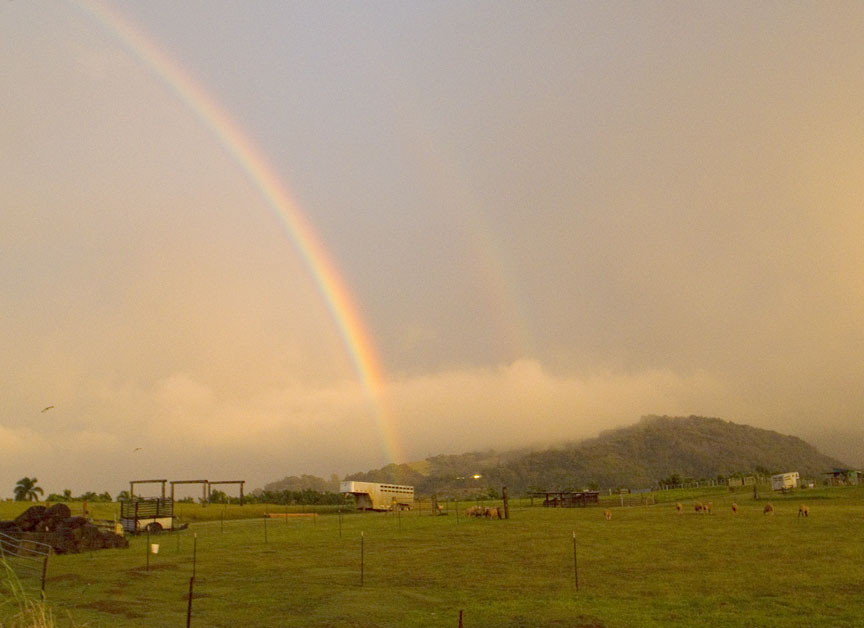 すると、朝焼けに照らされた虹が現れ、それはダブルとなり、一瞬だけだったけどトリプルとなる。