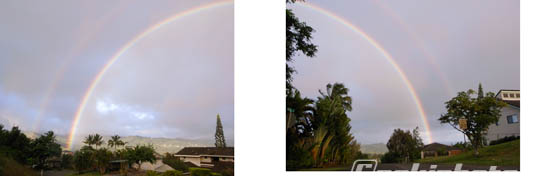 虹が大きすぎて、俺のGRDカメラレンズだと(35mm判カメラ換算値28mm)入りきらず、仕方がないので2枚横につなげても収まらないほど巨大な虹でした。