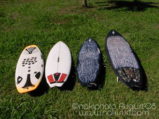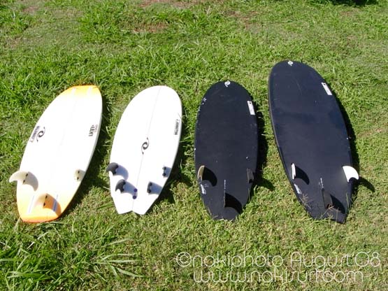 一番右側は名作第一号のAVISO 6'6" Rocket Fishで、ノースハワイではジョンが持ち込んだことからシーライオン(トド)モデルと認定され、その動きの良さからニックが愛し、そして俺も魅せられ、ジョンにお願いして借りています。