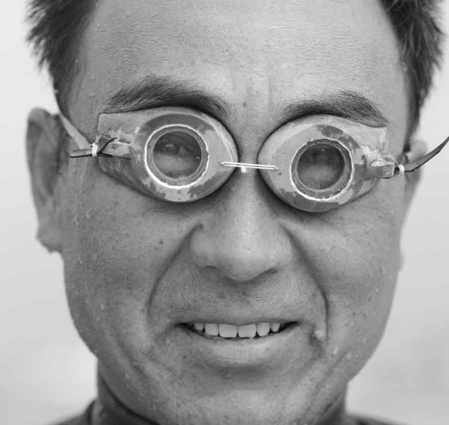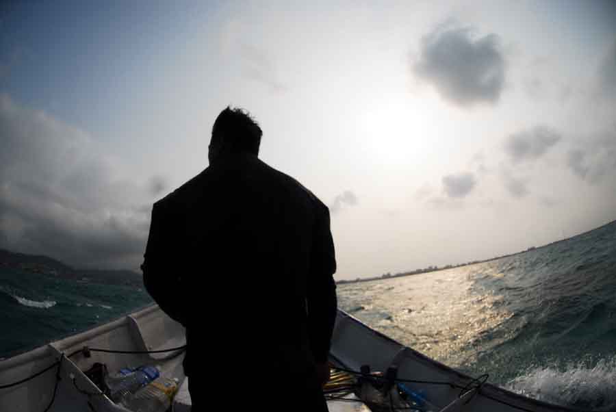 サバニの操船は、このように前方起立型で行う。