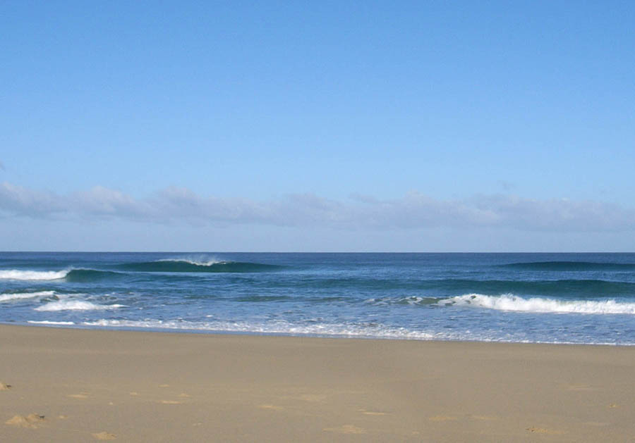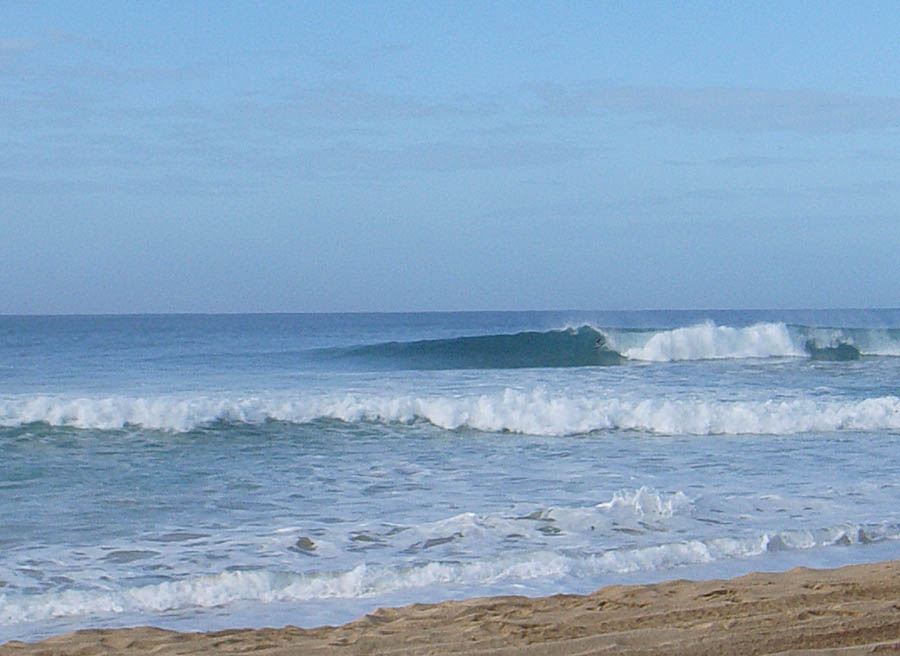 翌日からも同じように早朝カリチェで波遊び、潮が干くと、エストレオ・セントロに行く。このエストレオというのは黒砂遠浅の地形。それがびっしりと300m幅で決まり、柔らかな斜面と丸まった3角形の波先を見ているとまるで芸術品のように美しい。