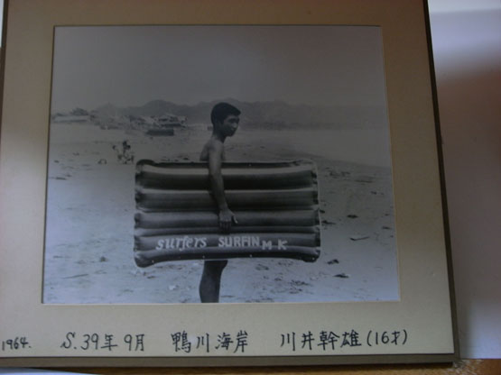 ↑最初はボディサーフィン、板子、そしてゴムマットと移行してからサーフボードに乗られるようになり、当時は銀座の洋書店『イエナ』でサーフ雑誌を購入してサーフィンの色々について研究したそうです。