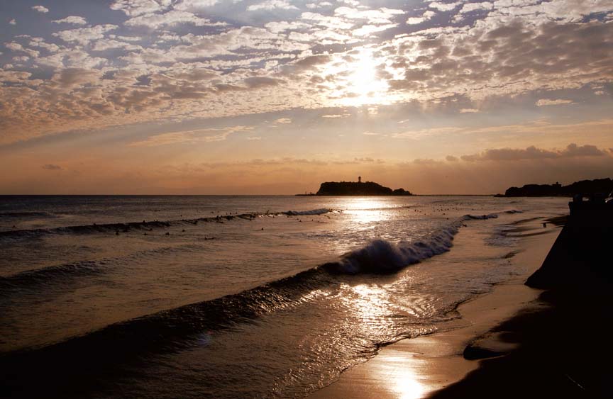 陽が照りつける広い浜、その右手に小動、奥には江ノ島、遠くには富士山が見える。