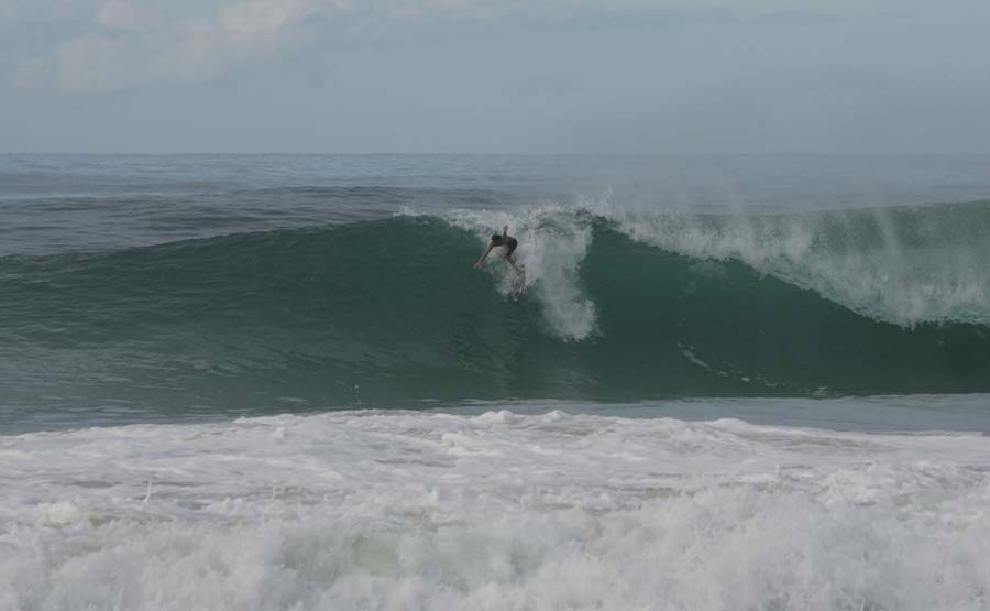 そして最高の波は、後半に乗った5フッターのインサイドバレルで、手前からダウンラインし、高速のままそのフックに合わせて吸い込まれた。