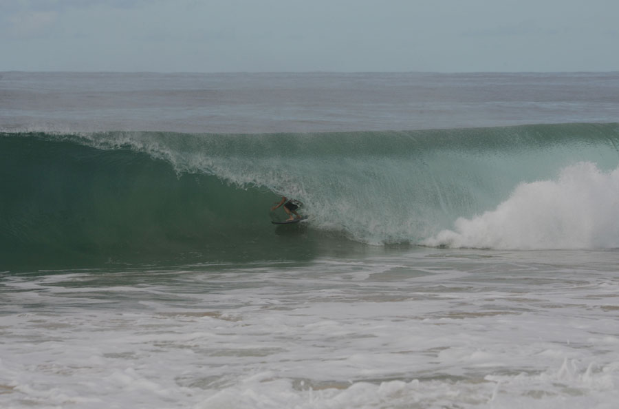 最悪なワイプアウトは、中盤に乗った5フッターで、この日は昨日まで突風となっていた貿易風であるイーストスウェル(東うねり)が残っていて、ここのファーストセクションにウエッジ(横波、こぶ)となって出現していた。