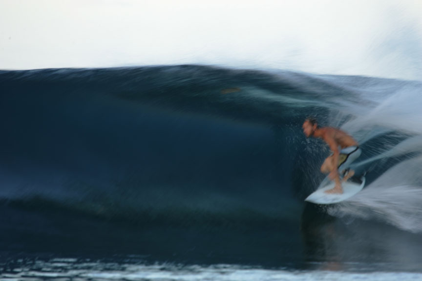 そのまま深いボトムターンを長く強く切り、フルスピードで崩れかけたリップの上に乗せるように角度のあるヒッティング。ボードがリップに乗る寸前にテイルに体重を乗せ、レイルを入れ替えると、ズリンと低い姿勢のままオフザリップ。フィンが波に咬みスライドを止め、また滑降し、今度はセクションの終わりで体を前に出しながら、波のショルダー側から一気に引きつけるスラッシュでボードのノーズを一気に逆方向に引きつけます。ザオウッと派手な音をレイルから立てて戻るボード。その独特の速度感覚に魅了された。