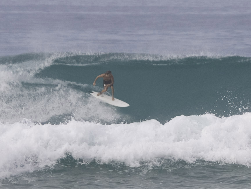 テイクオフが通常のRNFより速い、これは4フィンのなせるプレーニング(揚力)なのかなあ、不思議なほど走り出しが速い。ノーズも通常のRNFよりチョンと上がっている。ハングファイブ、スイッチスタンス、なんとエアも思いのままだ。