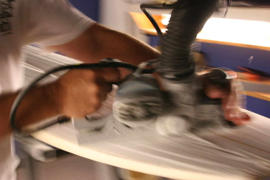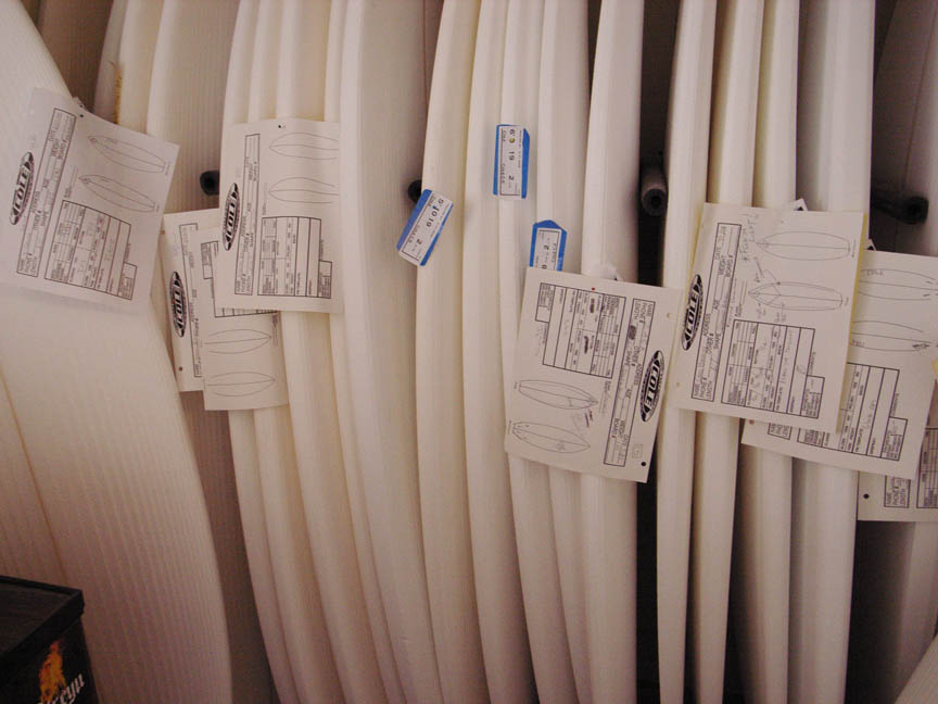 大きな理由はさっき言ったブランクスの供給でしょ。後はプレシェイプマシン、つまりKKLという会社が俺のシェイプデザインのほとんどを持っているんだけど、あそこは2本づつしか削れない。だから同サイズのオーダーが来るまで待っていたら、そのままになっちゃって、これじゃいけないと、今度はもったいないけどシングルでカットをする頃には、オーダーカードをもらってから5週間経っちゃったりしているんだ。はっきり言って「申し訳ない」って思っているよ。全ては俺の管理が悪いんだけど、実はいいニュースがあって、向かいのティミー(・パターソン)で新しいシェイプマシン導入したでしょ、あそこでこれからシングルで切ってくれる、と言うからこれからは変わるはずだ、早くなるからさ。