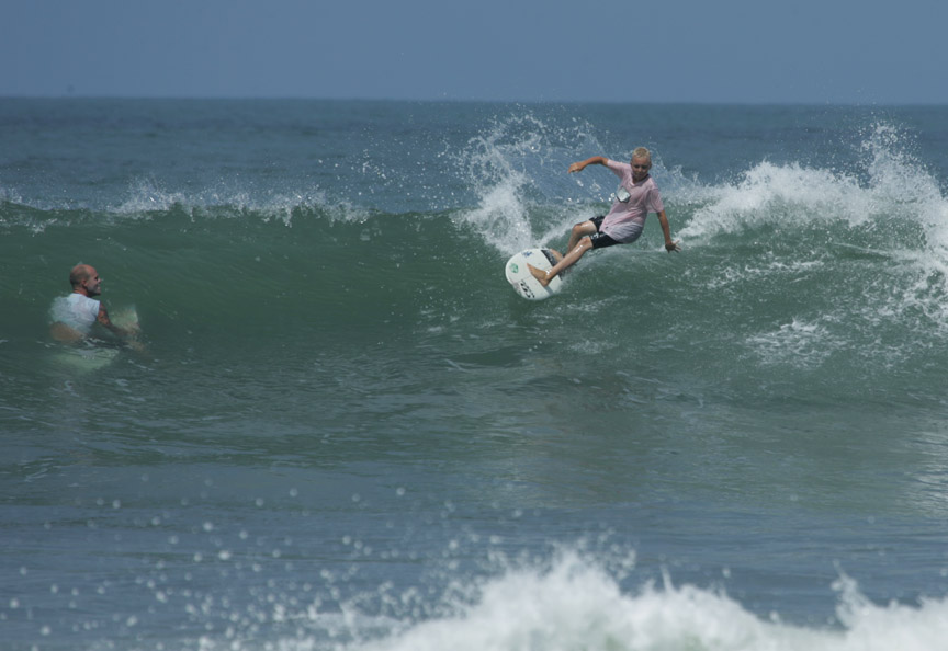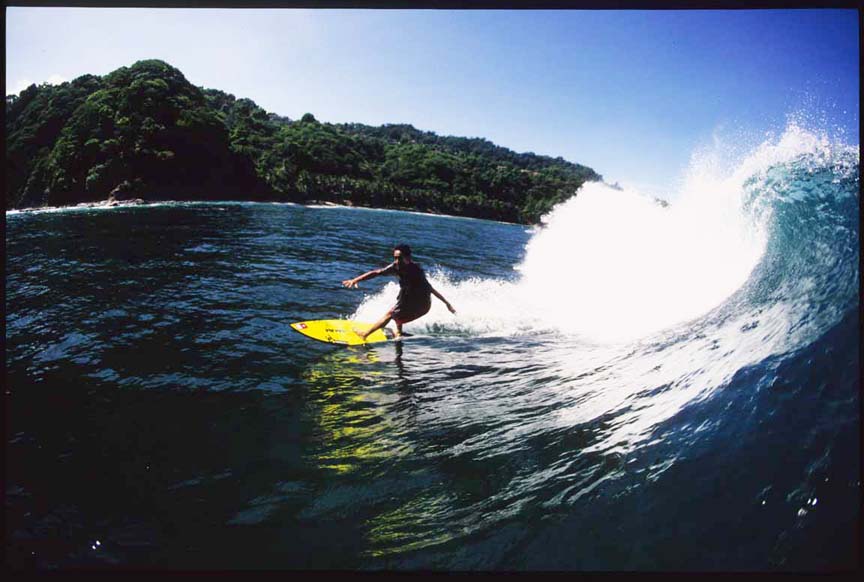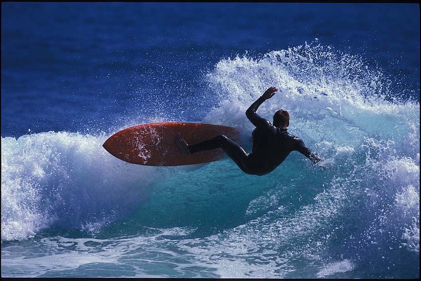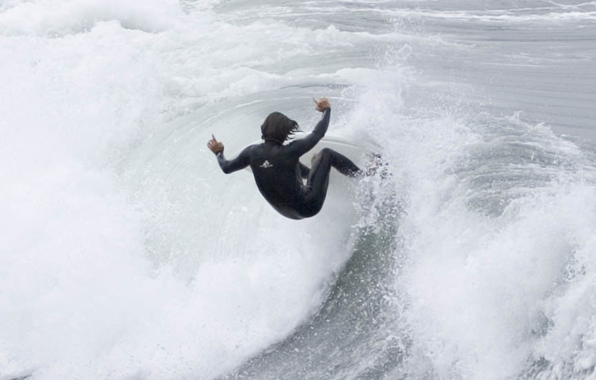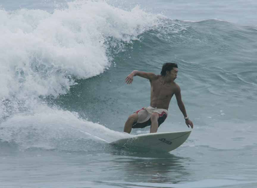 壁が20mほどある、ものすごくいいレフト波に乗って、ボトム、トップターンを繰り返してして、そのまま300mほど突き進み、コーナーでカットバックして、波の段の下に入り、岸まで行けー、と乗り継いで浜までの超ロングライド。