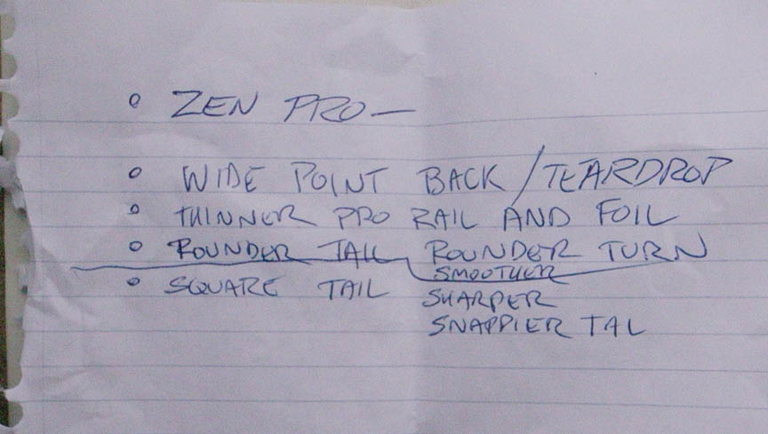 俺も昨日ZENをシェイプしながらそんなことを考えていたところ。不思議だよな。そうだな、ではZENより全体的のフォルムを薄くして、テイクオフは犠牲にしてもいいからターン特性を上げたモデルを作ろうよ。The Vertical Masterを簡単だよ。うまくできるさ。
