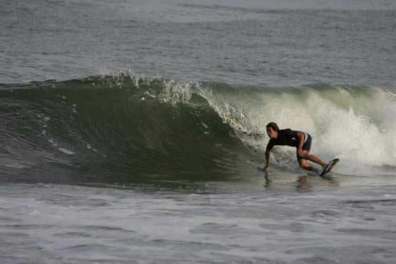 ↑波面とボード角度の融合を確認しながらテイル(右足)を深く押します。