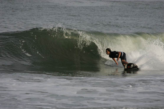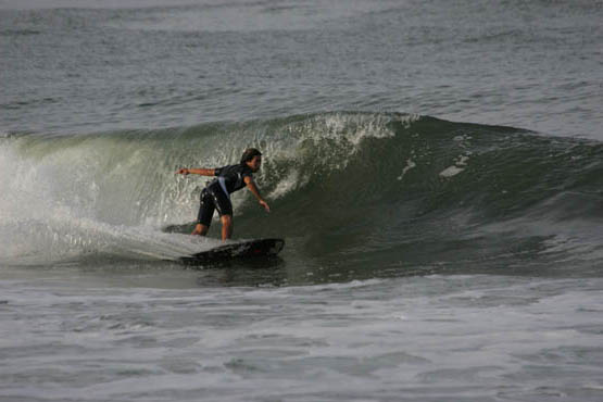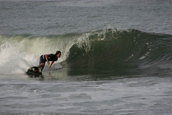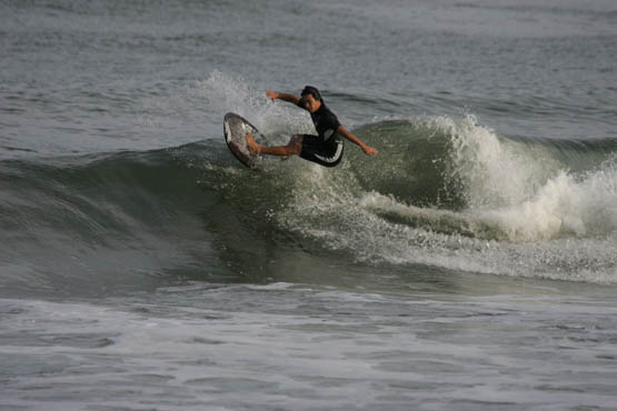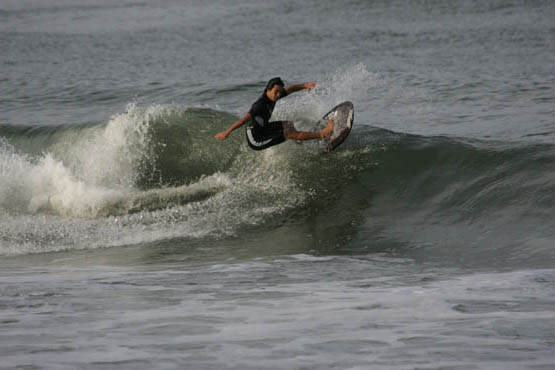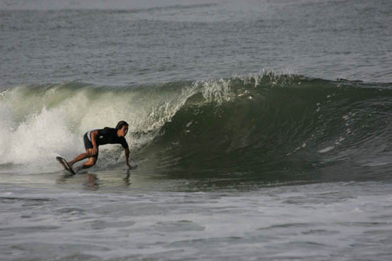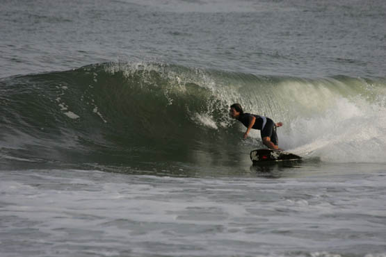 この手前で足を波側に折りたたみ、内側のレイルに重心を移していくのです。(北斗神滑)