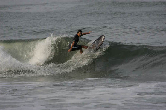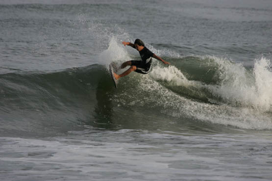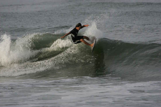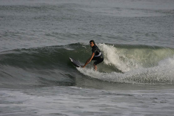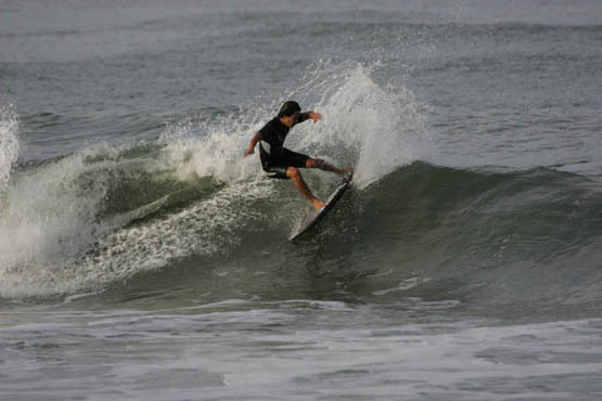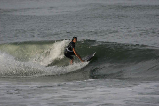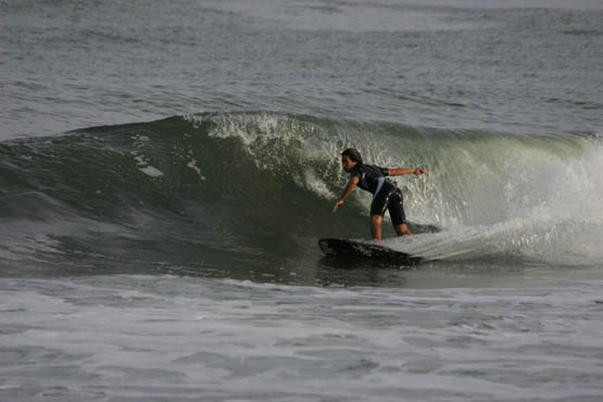 ↑この位置で波のどの箇所で切り返すかを見極め、ボードを左手、左側、岸側に大きく切り返し始めます。