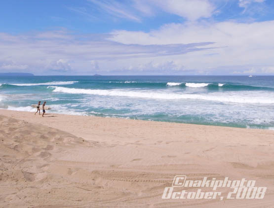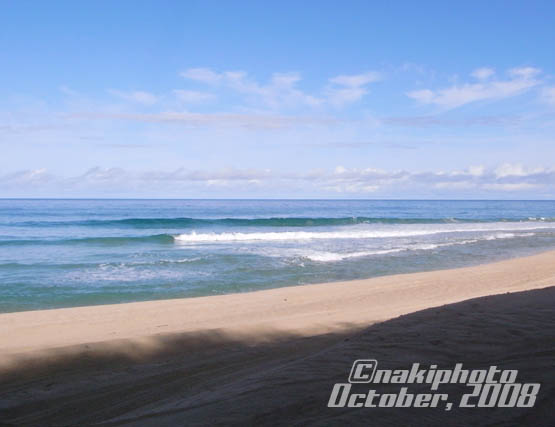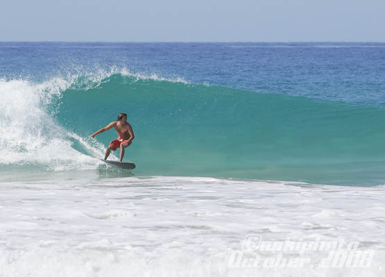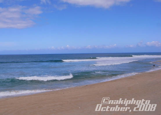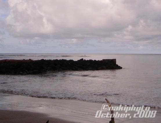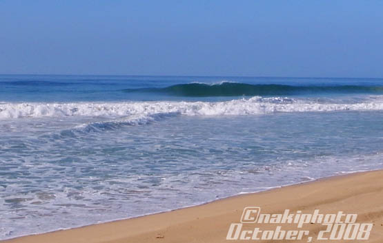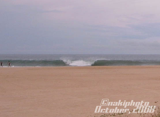 ショアブレイク系なので浅いリーフに激突するか、下手をすると首の骨を折る系なので、あきらめてイナリーズ手前を見ると、ここも同様に「どん深」の地形で、波は一気に砂浜に炸裂していた。