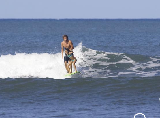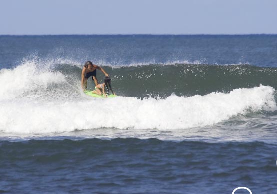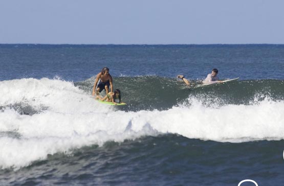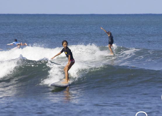 カイラ(前)、ノアは後ろで逆真流ノーズライドをしています。
