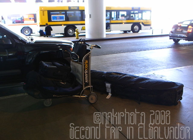 荷はボードケースと、ダッフルバッグ、カメラバッグにラップトップケースといういつものスタイル。