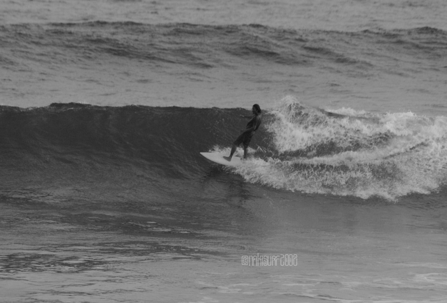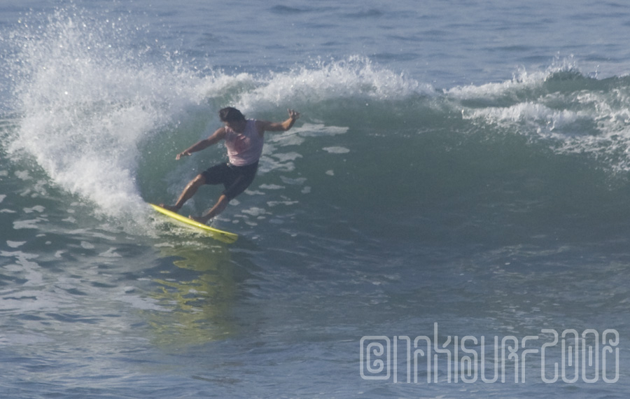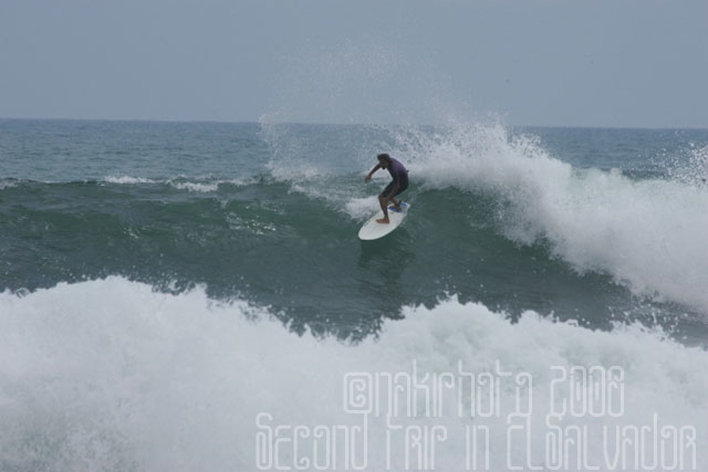 一本目がこの波で、見事にテイクオフしてこんなスクエアなボトムターンを見せて、何度もターンを切れ込ませながらインサイドまでメイクした。