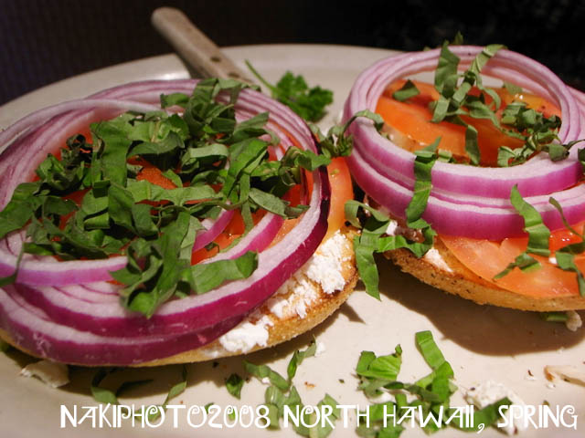 彼はベーグルのオープンサンド、