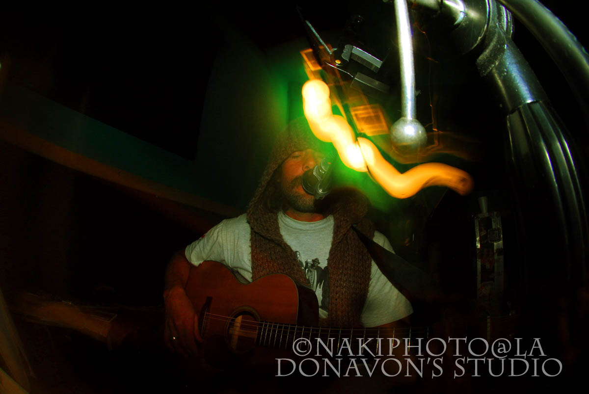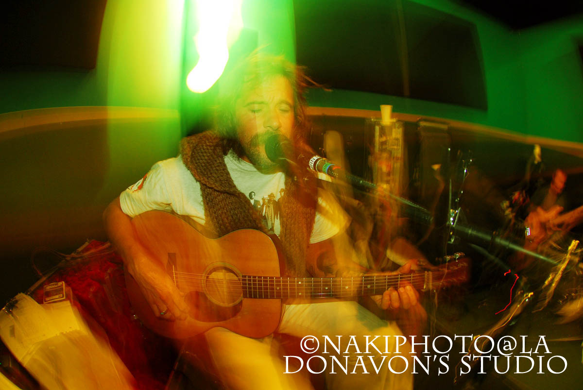 コードとブリッジ進行をバンドメンバーに伝え、アコースティックオンリーの曲の数々を歌い上げるドノバン。
