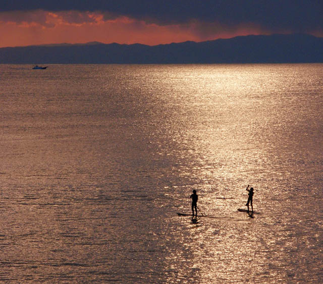 夕刻に波乗道の門弟たちが浜に降り、色彩を増した海面を箒(ほうき=パドル)で掃く