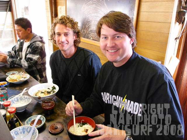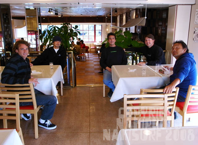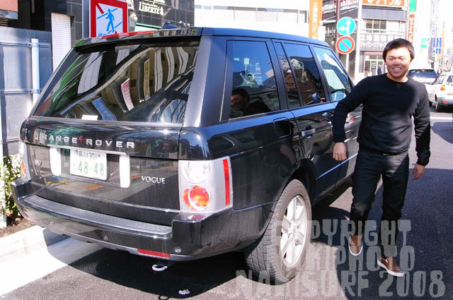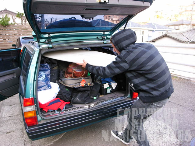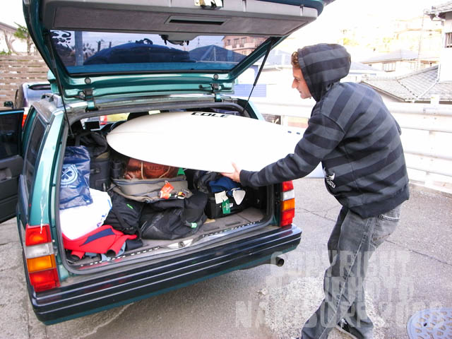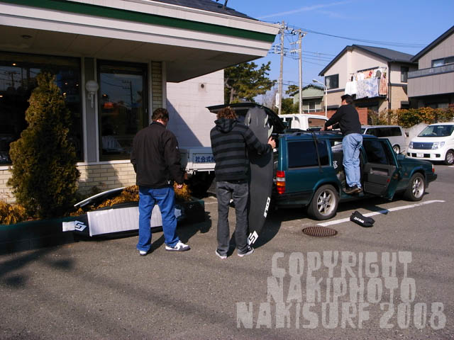 で、AVISOクルーは鎌倉を経て、辻堂のデニーズで朝食を摂り、駐車場でボードの積み替え大作戦決行中。