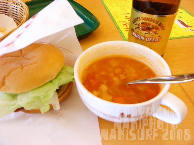 そのまま横のモスバーガーに行き、テリヤキチキンバーガー(マヨネーズ抜き)と、ミネストローネスープをビールでいただきました。