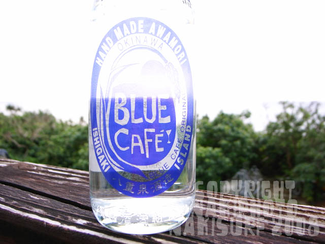 ↑お酒はしま(島酒)で、これはブルーカフェボトルに入った八重泉の3合瓶。
