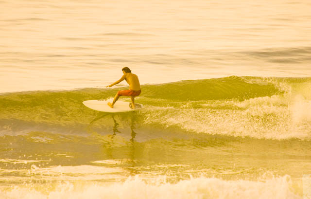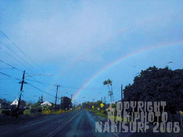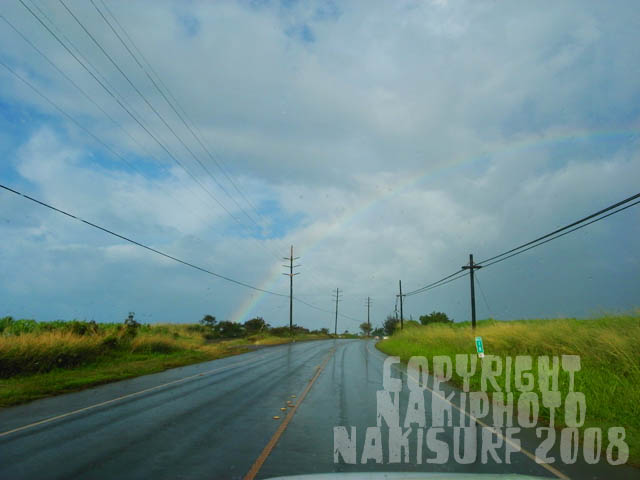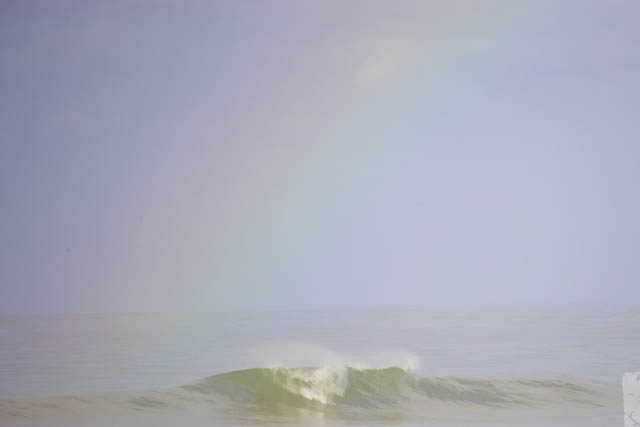 無人の波を滑走していると、グリーンフラッシュの夕陽と、大きな、距離のある虹が出たのであった。