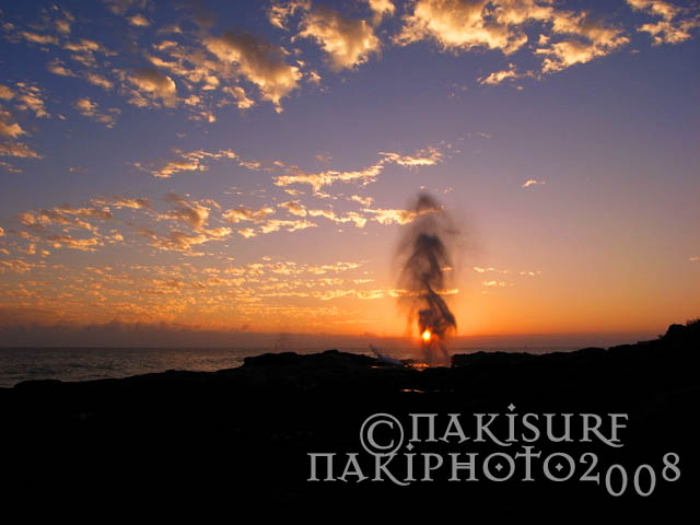 そして潮吹き穴の向こうに沈む夕陽をばしゃり。