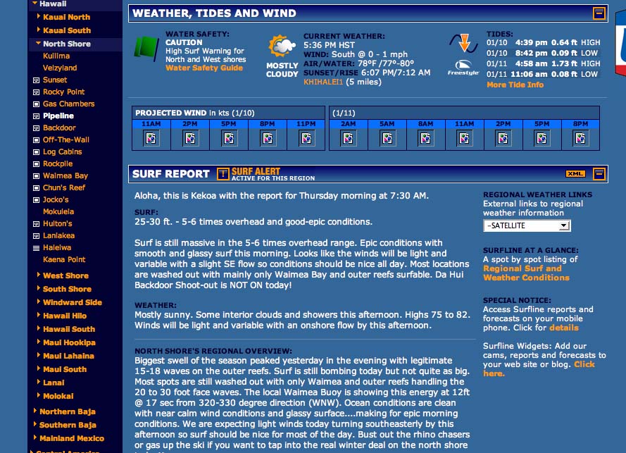 帰ってきてサーフラインのレポートをチェックすると、パイプラインで25〜30フィート。人間の背丈5〜6倍と掲載されている。