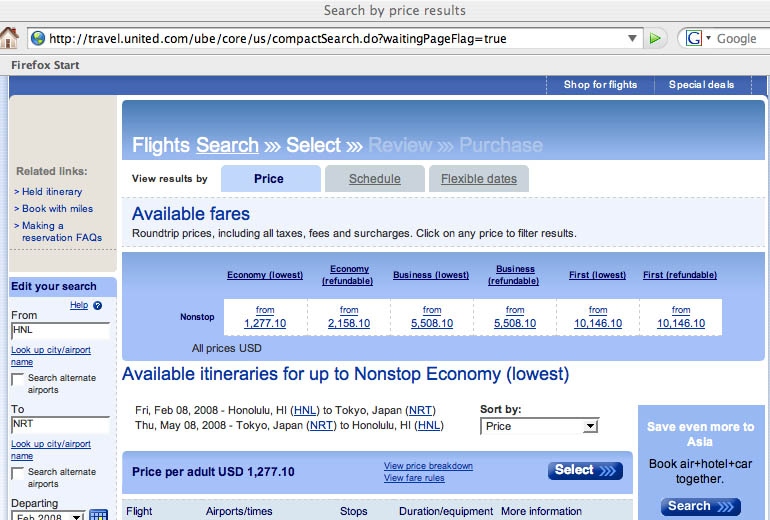 ちょうどユナイテッド航空からメールで「激安チケット手配」とあったので、ホノルル(HNL)から成田(NRT)往復と入れて値段検索したら、こんなのが出てきた。↓
