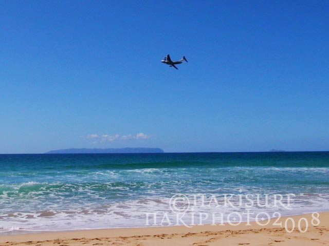 天国のような海岸の横から飛び立つ海軍軍事輸送機。