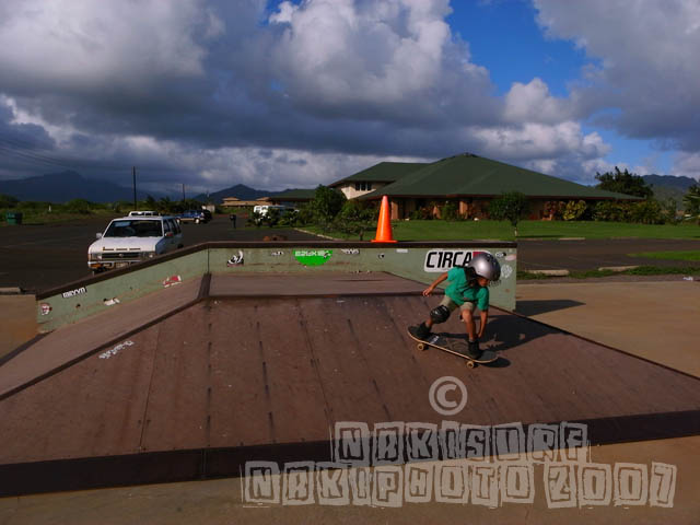 ↓波がまだ小さいので、ノアを連れてスケートボードパークに。