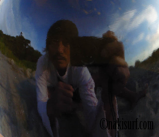 ちょうど目の前に凸凹フェイスの波が崩れようとしていたので、そのまま大きく息を吸い、波の下に潜る。
