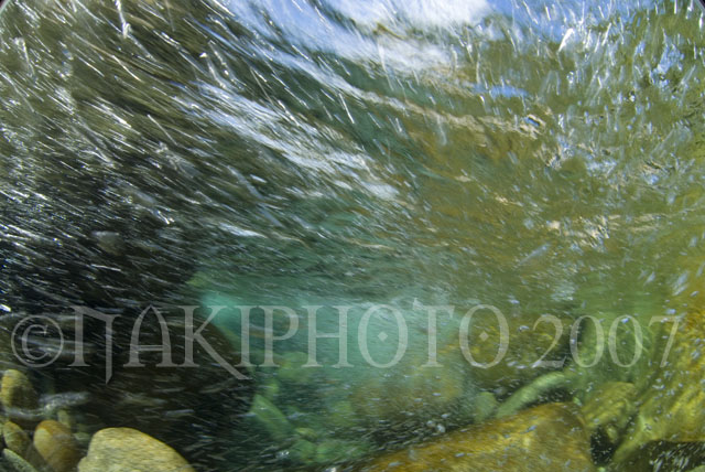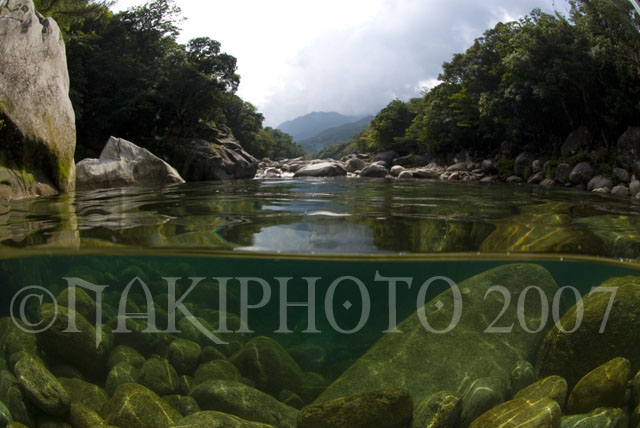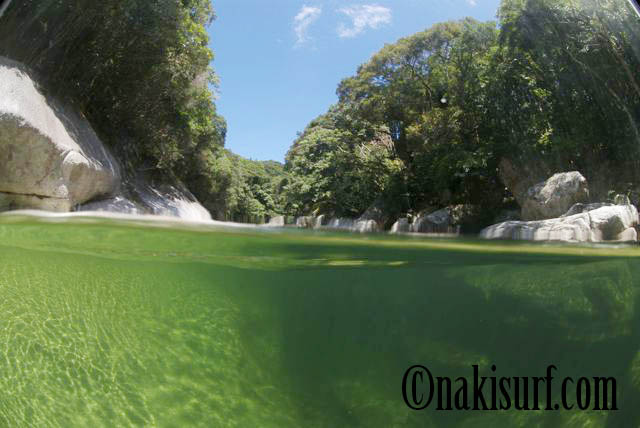 流れ込みの急流を逆らい泳ぎ、大岩の向こうまで行くと、深緑色をした水底。