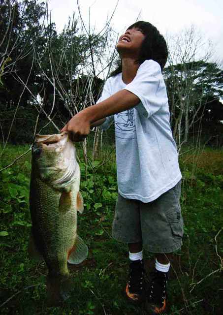 と叫んでいるので、走って駆け寄るとこのオオクチが彼が投げ捨てた竿先で土の上をビタンビタンと弾けていた。