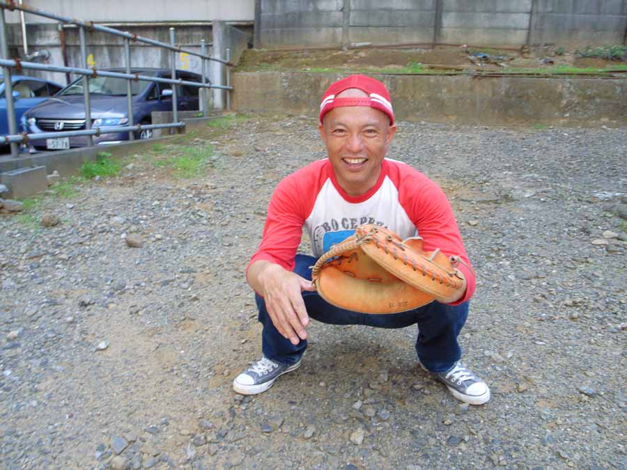 このようににこやかに松坂の90マイル高速スライダーを捕りました。
