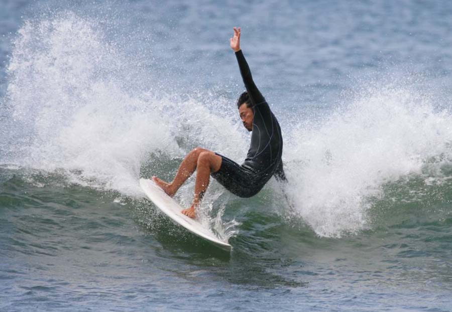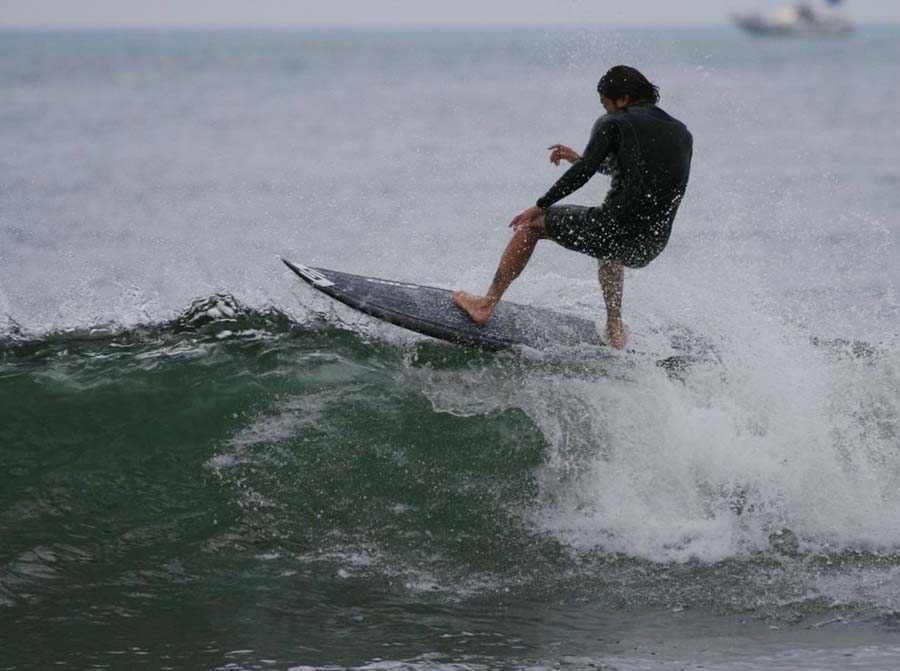 隠し浮力と4フィンの特性がこの弱い膝波にマッチし、ロングボード以外では唯一テイクオフできた。
